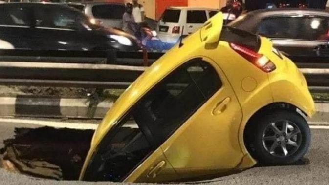Nasib apes dialami pengemudi Perodua Myvi di Malaysia. Saat melaju di jalanan, tiba-tiba mobil yang di Indonesia dikenal dengan Daihatsu Sirion itu tiba-tiba terperosok, nyaris ditelan bumi.